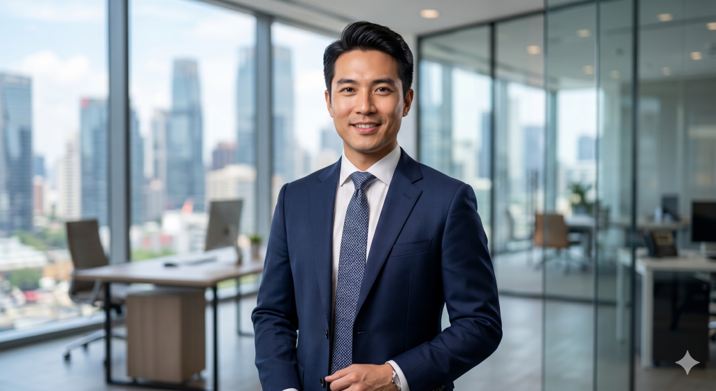 Prompt copy: “Tạo một bức ảnh chân dung bán thân chuyên nghiệp của một [nam doanh nhân châu Á, độ tuổi 30]. Trang phục: [Áo sơ mi trắng, áo khoác vest xanh navy, cà vạt lụa]. Biểu cảm: Thần thái tự tin, mỉm cười nhẹ, ánh mắt kiên định nhìn thẳng ống kính. Bối cảnh: [Văn phòng làm việc hiện đại, có cửa kính lớn nhìn ra thành phố], làm mờ phông nền (xóa phông). Kỹ thuật: Ánh sáng studio đánh khối (softbox), 8k resolution, siêu sắc nét, photorealistic.”