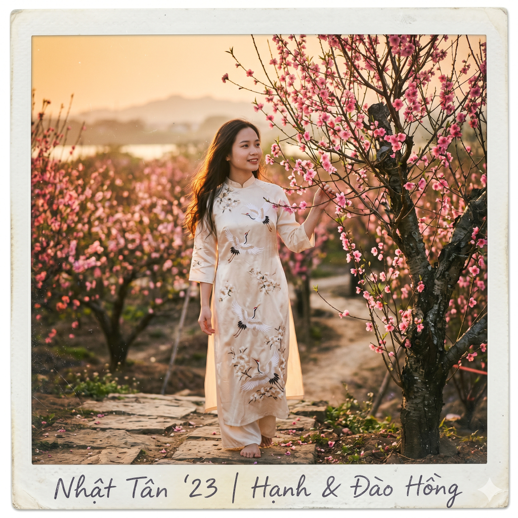 Prompt copy: “Tạo ảnh chân dung một [cô gái Việt Nam trẻ trung, nét đẹp Á Đông], đang mặc [áo dài truyền thống bằng lụa tơ tằm màu đỏ thắm, thêu họa tiết chim hạc và hoa mai vàng]. Bối cảnh: Đứng nép mình bên một [gốc đào cổ thụ đang nở rộ tại vườn đào Nhật Tân], không gian ngập tràn sắc hồng. Biểu cảm: Nụ cười mỉm nhẹ nhàng, tay chạm nhẹ vào cánh hoa. Kỹ thuật: Ảnh chân dung (portrait photography), xóa phông mù mịt (bokeh), ánh sáng tự nhiên ban ngày, nắng xuân dịu nhẹ. Chất lượng 8k resolution, highly detailed, masterpiece.”