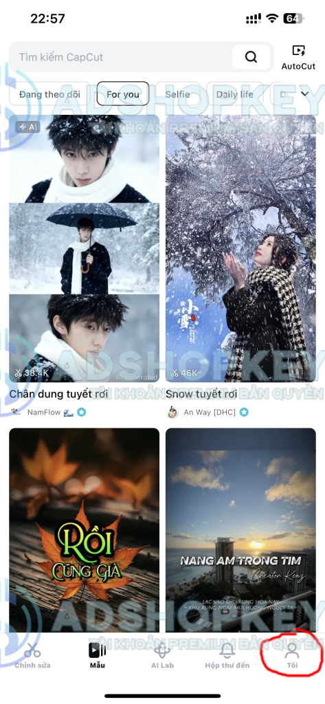 Bước 1: CẬP NHẬT APP CAPCUT TRÊN APPSTORE HOẶC CHPLAY LÊN PHIÊN BẢN MỚI NHẤT. Sau đó Khởi động App Capcut trên điện thoại >> Tôi