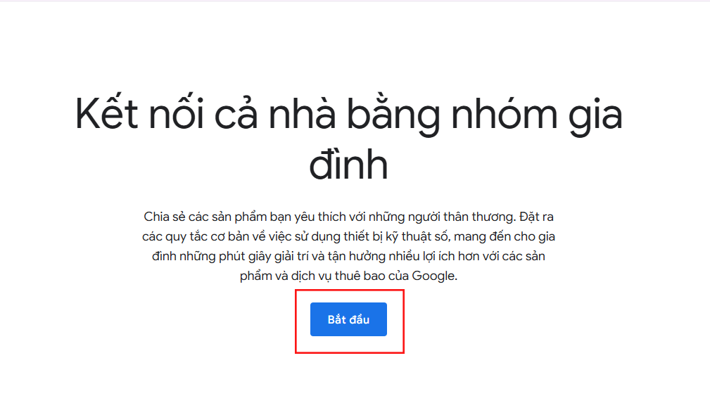 Lưu ý: Tài khoản cần nâng phải chưa tham gia Family Google, bạn có thể check bằng cách truy cập: https://families.google/intl/vi/families/ >> sau đó Ấn chữ bắt đầu như hình. Nếu đã tham gia rồi thì cần gửi mail khác cho mình để thực hiện nâng cấp.