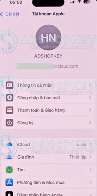 Bước 2: Ấn thanh toán ngay sau đó quay ra phần cài đặt trên điện thoại để lấy địa chỉ iCloud như sau: