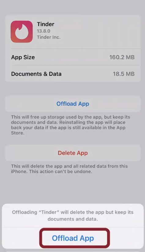 Bước 3: Chọn vào Tinder APP >> Offload App